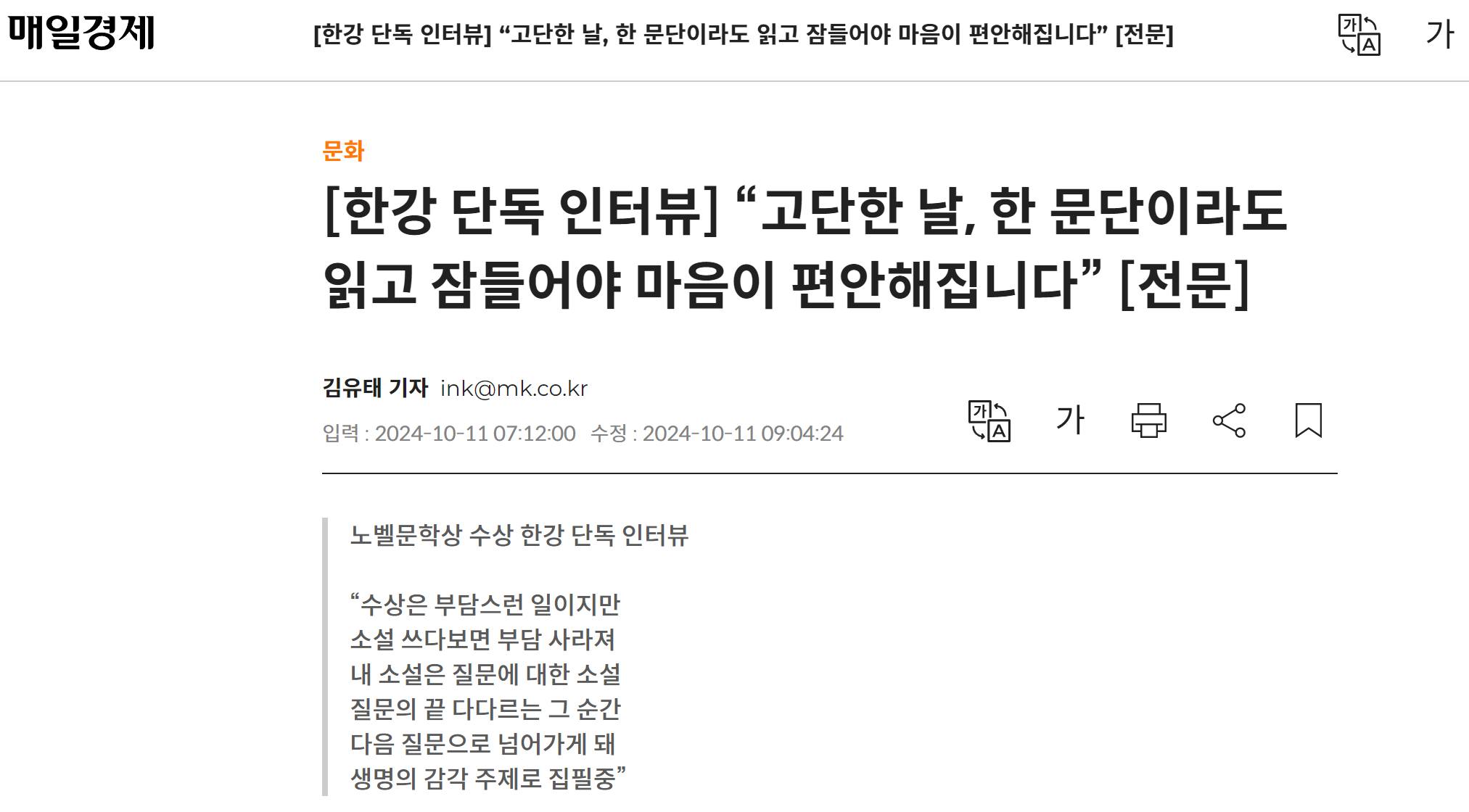 '매일경제'를 구독 중인데 이 신문은 매주 토요일 두 개 지면을 털어 책을 소개한다. 신문의 전체적인 수준이나 방향과 별개로 개인적으로 좋아하는 섹션이다. 이 섹션에서 소개한 책을 제법 구매하기도 했고, 책 소개를 꼼꼼하게 읽기도 한다. 이 북섹션에 자주 이름이 보이던 김유태 기자가 노벨문학상 발표 직전에 한강 작가와 이메일 인터뷰를 했던 모양이다.