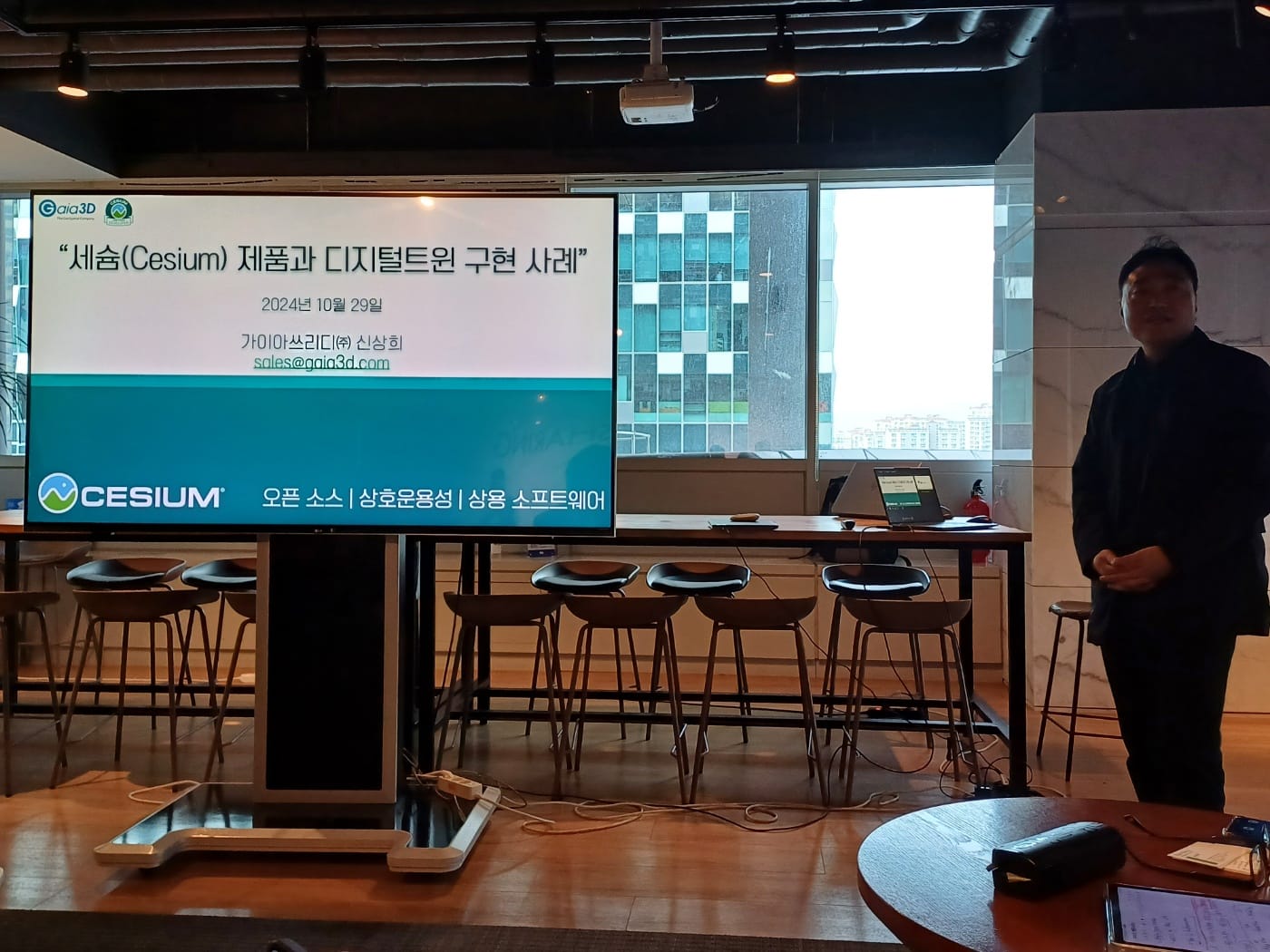 지난 9월 미국 벤틀리시스템즈 본사가 Cesium사를 전격 인수했는데요. 그 연장선에서 벤틀리시스템즈코리아와 가이아쓰리의 협력 강화를 위한 논의를 진행해 왔습니다. 미국 Cesium이나 저희나 전통적으로 공간정보 분야에서 사업을 많이 수행했는데요. 앞으로 벤틀리시스템즈와 협력을 통해 공간정보와 건설/토목/인프라 분야의 융복합이 가속화되기를 희망합니다. 요즘 핫하게 떠오르는 CAD/BIM과 디지털트윈의 통합도 조금 더 수월해지지 않을까 싶습니다.