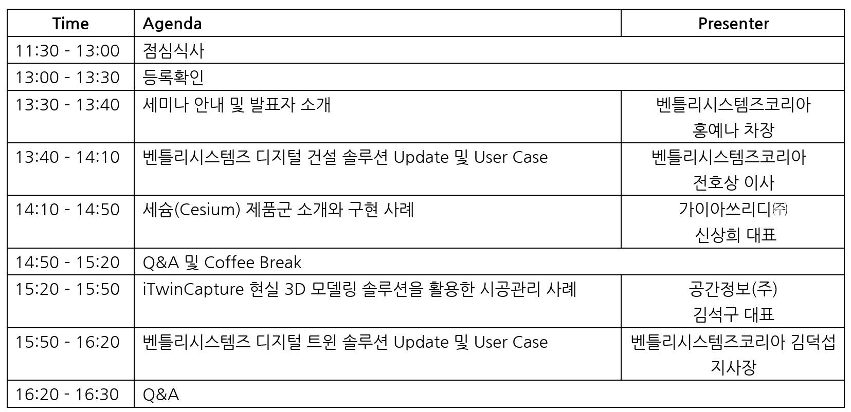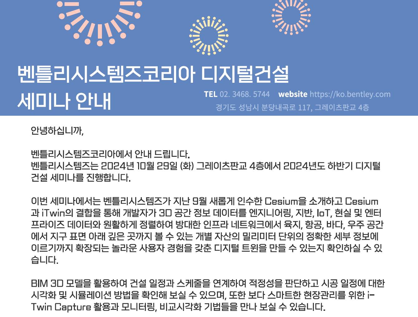벤틀리시스템즈코리아가 주최하는 디지털건설 세미나에서 세슘(Cesium) 제품군과 디지털 트윈 구현 사례를 소개하였습니다.