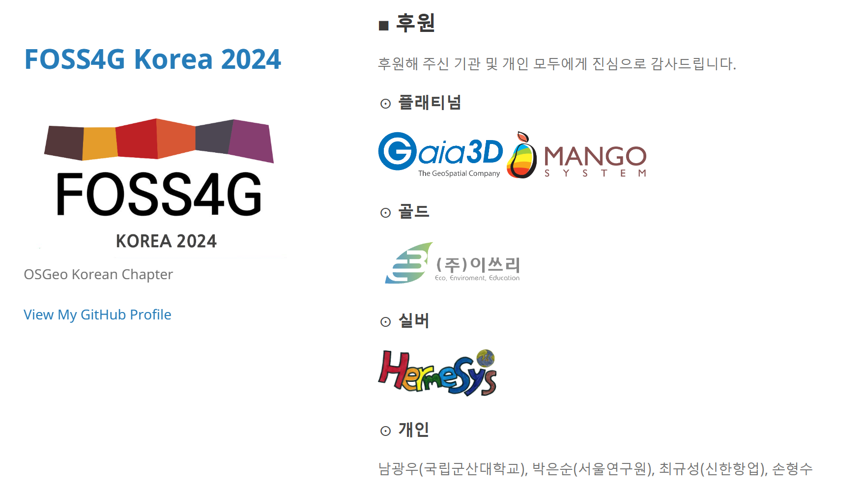 11월 28일과 29일 이틀에 걸쳐 개최되는 FOSS4G Korea 2024 대회(https://foss4g.osgeo.kr/)에도 여러분의 많은 관심 기대합니다. 11월 10일까지 발표자와 워크샵 모집 중입니다. 감사합니다.