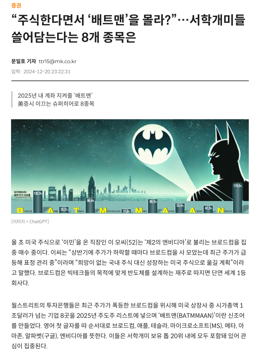 BATMMAAN: Broadcom, Apple, Tesla, MS, Meta, Amazon, Alphabet, Nvidia을 일컫는 금융권 조어로서 미국 상장사 중 시가총액 1조달러가 넘는 기업 8곳을 포함.