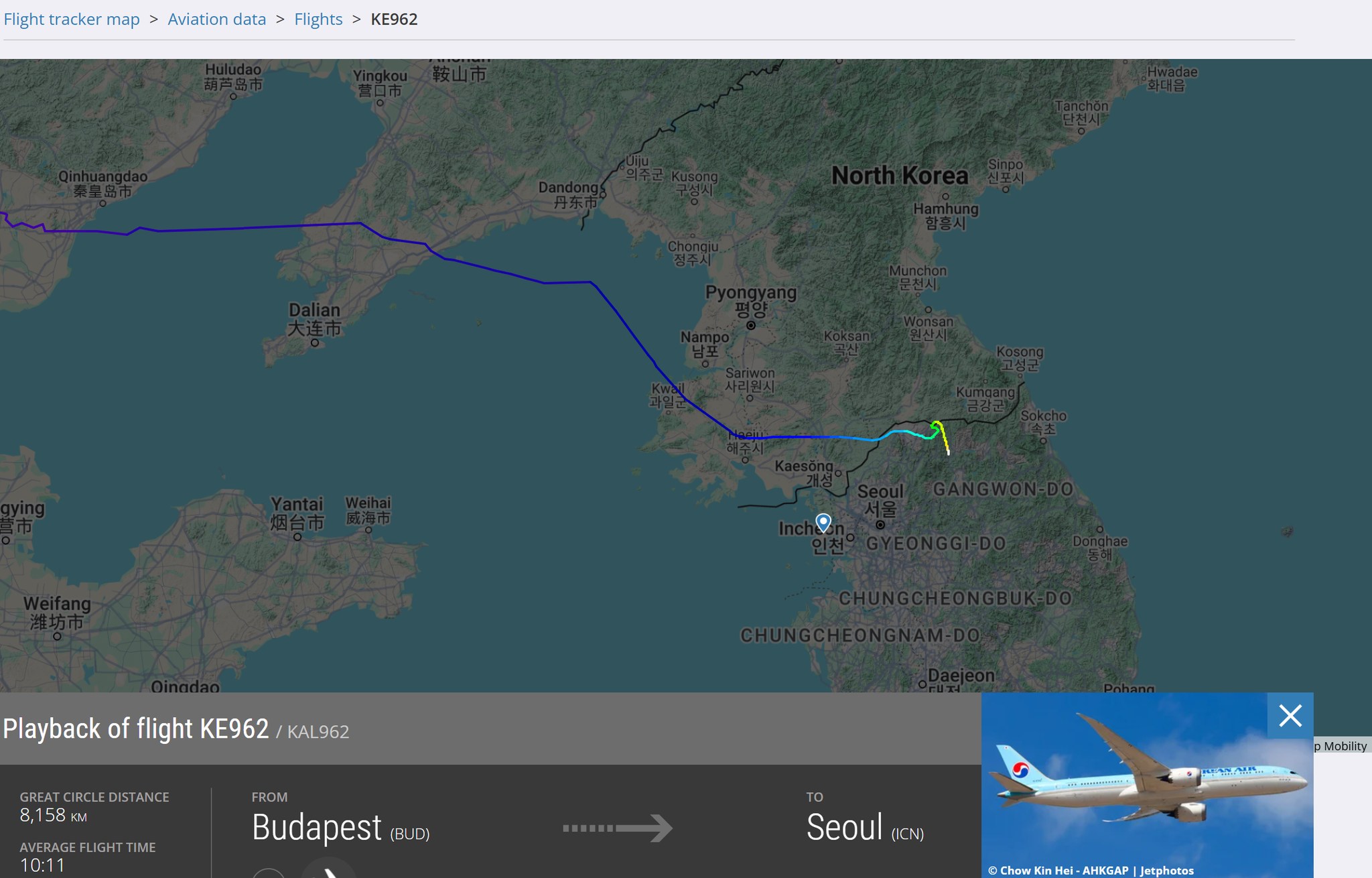 대한항공이 북한 영공을 비행했다고 해외 커뮤니티에서 시끌벅적. 대한항공에서는 정상 항로를 운항했다고 해명. 원주쯤에 착륙한 걸로 나오는 경로를 인천공항쯤으로 보정해 보면 딱히 북한 영공 침범하지는 않은 듯. FlightRadar24에 기록된 경로가 실제 비행경로와 많이 달랐다고 하는데 이렇게 많은 차이가 난 이유가 뭘까 궁금하기는 함.