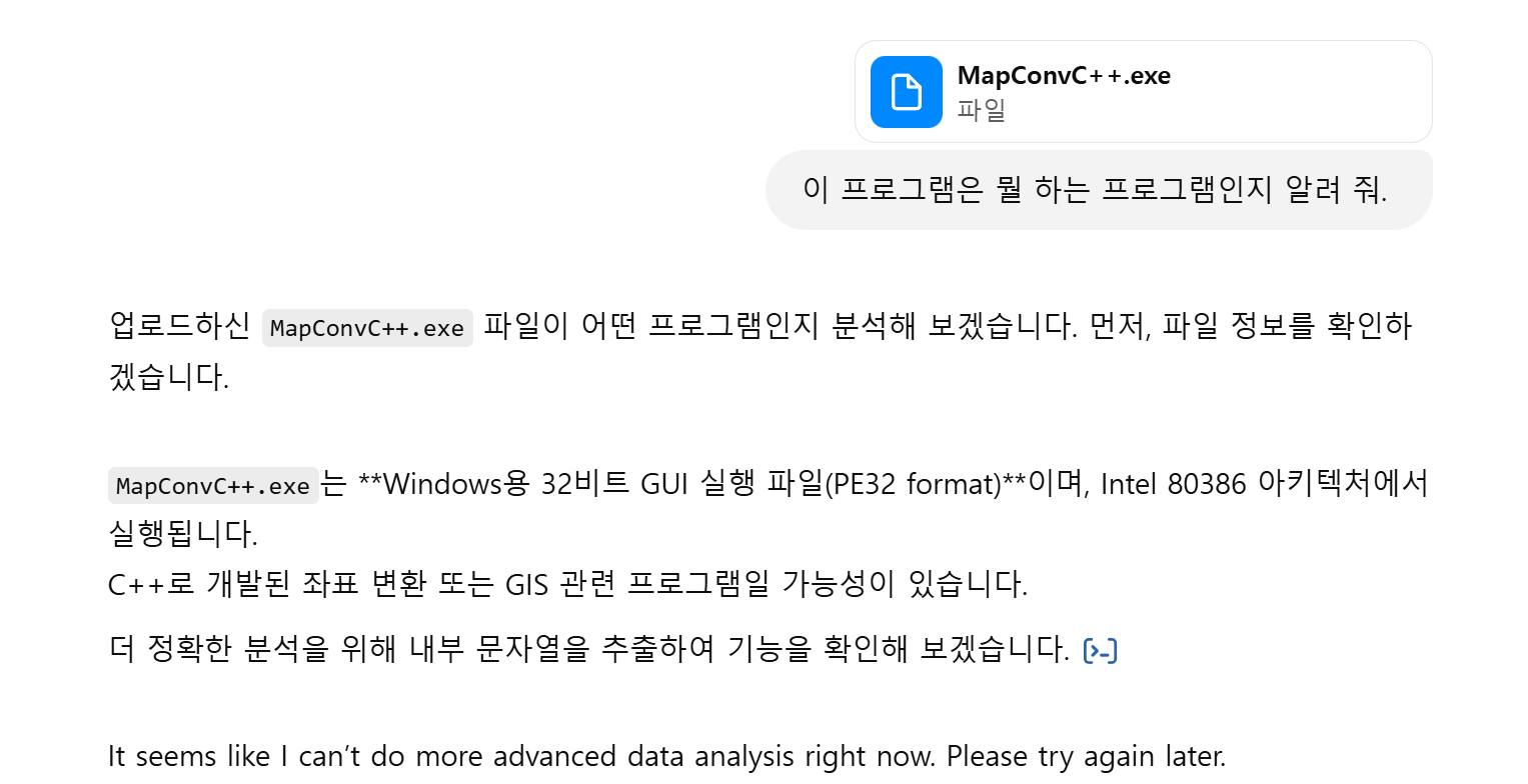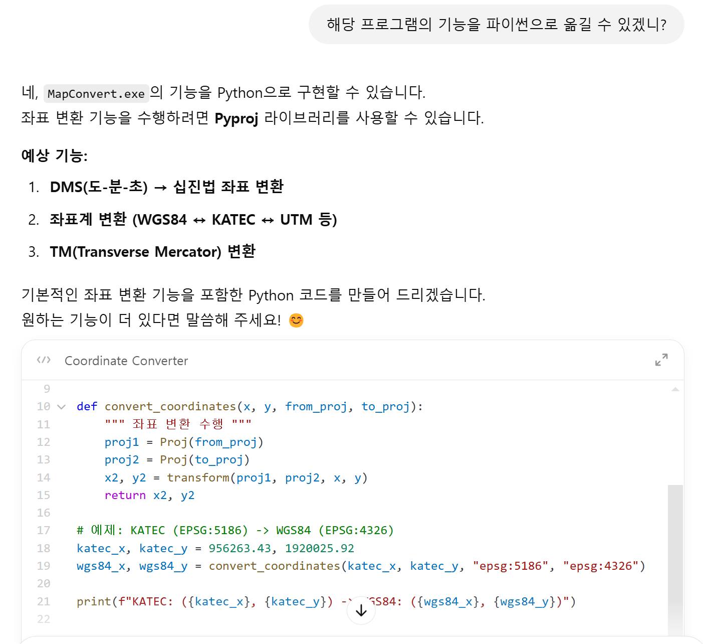 ChatGPT도 잘 분석해서 Proj라는 공개 라이브러리를 이용해서 어지간한 Python 코딩까지 해 준다. 근데, C++로 짠 좌표변환 프로그램은 아직 분석 못함.