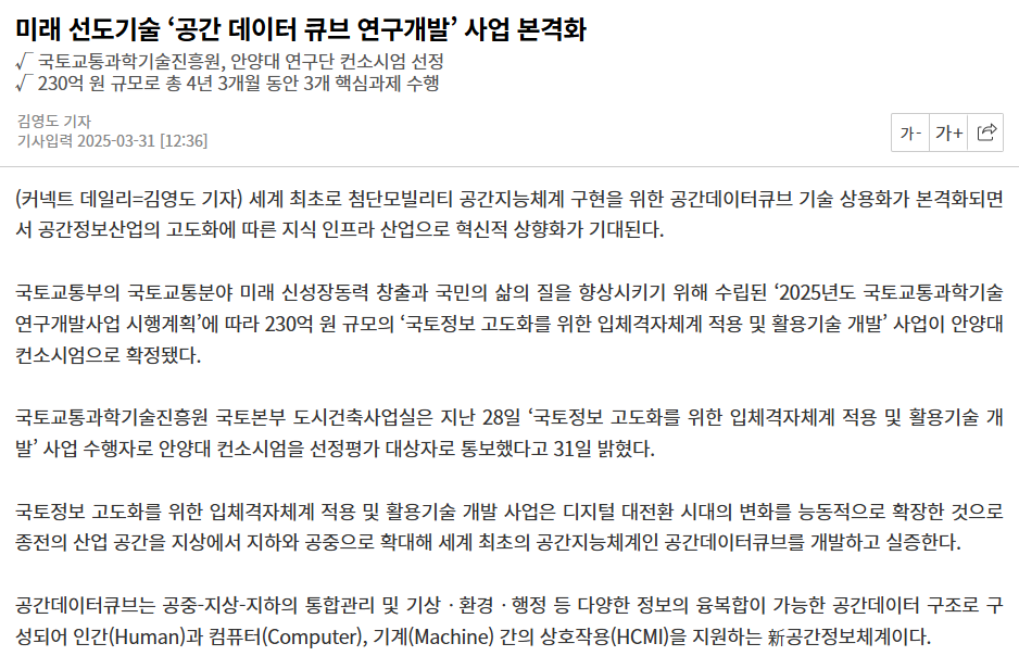 가이아쓰리디도 공간데이터큐브연구사업에 참여하여 작은 기여나마 할 예정입니다. 사업 준비하시느라 고생하신 안종욱 교수님 및 여러 연구진께 깊은 감사 드립니다.
