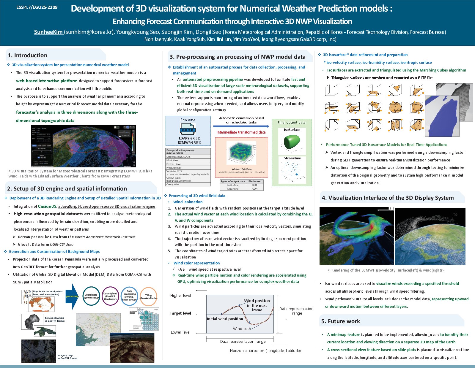 Forecasters from the Korea Meteorological Administration (KMA) shared their experience implementing a 3D visualization system for numerical weather prediction (NWP) models at EGU25. The system enables the 3D rendering of gridded model outputs like wind, temperature, and humidity, providing deeper insight into vertical structures and atmospheric dynamics.