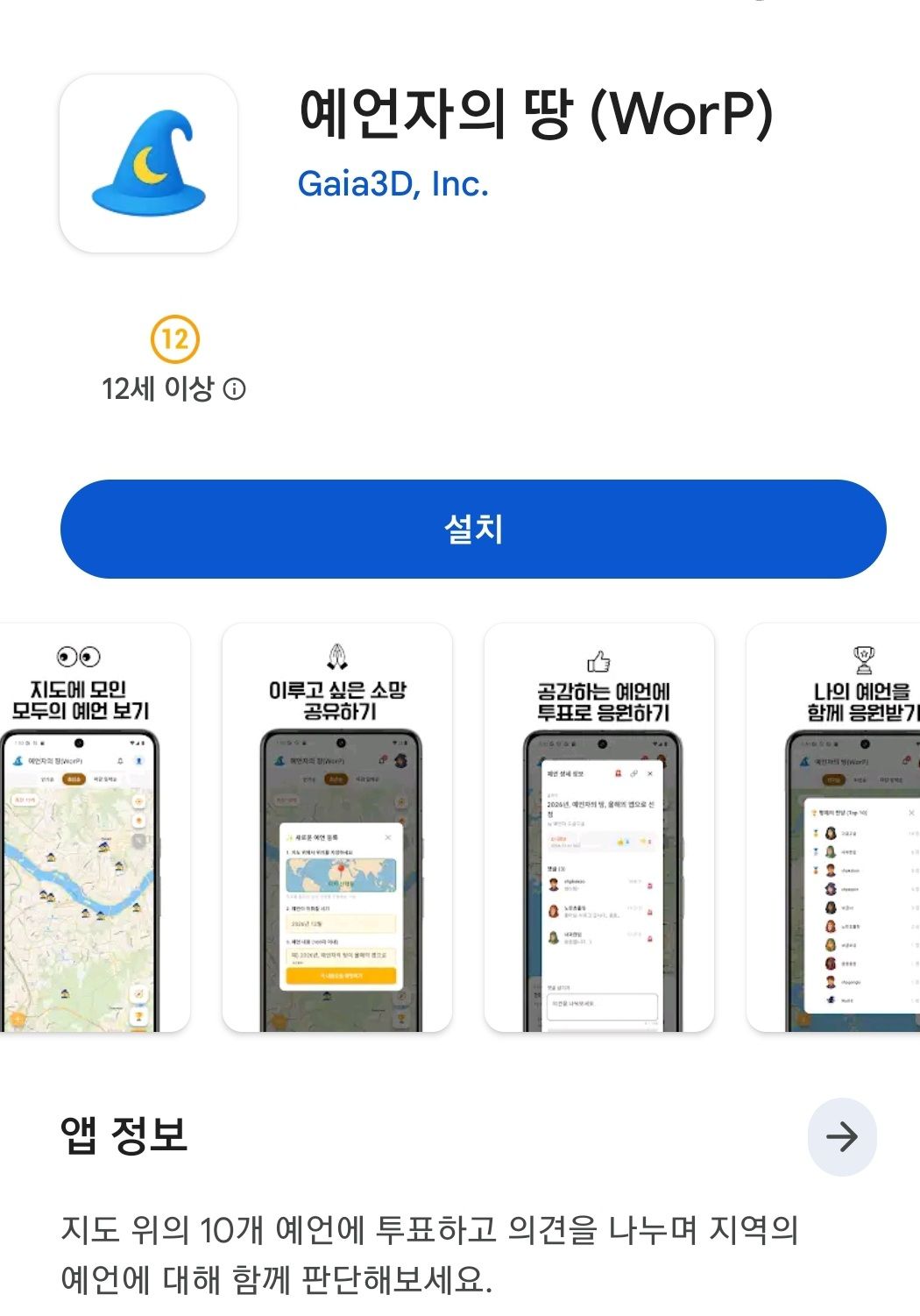 '예언자의 땅(WorP)는 원하는 장소에 예언을 하고 당신이 유명 예언자가 되도록 돕습니다. 다른 사람이 그 지역에 어떤 예언을 했는지 살펴보셔도 됩니다. 인류는 언제나 예언자와 그 예언을 갈망했습니다. 이제 당신이 그 예언자가 되어 세상의 주인이 되십시오.