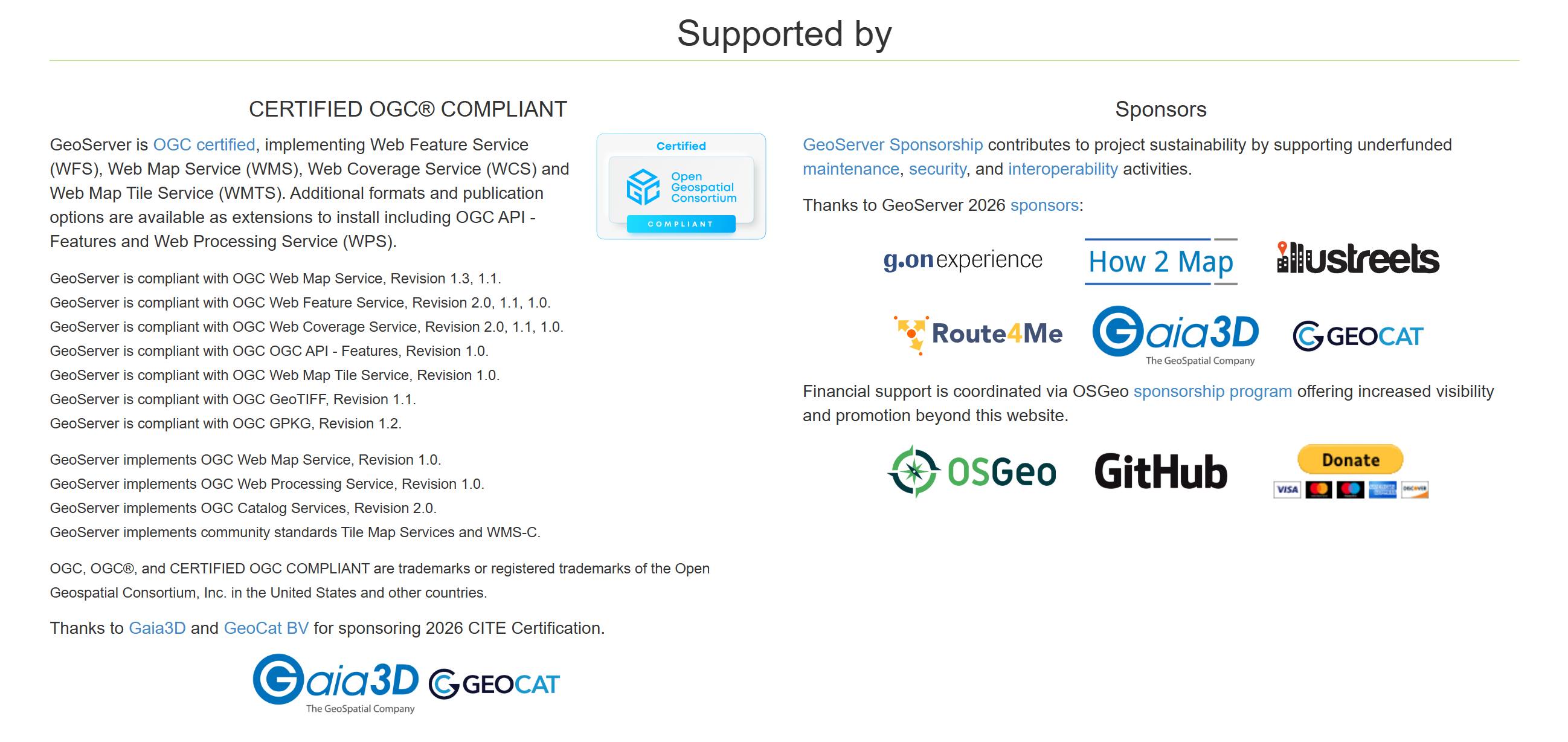 대한민국 대표 오픈소스GIS 기업인 가이아쓰리디(http://www.gaia3d.com)는 2025년에 이어 2026년에도 GeoServer(https://geoserver.org/)의 OGC 표준 호환성 인증 테스트 비용을 후원합니다. GeoServer는 Java 기반의 Web Map Server로 전 세계에서 광범위하게 사용되는 오픈소스 프로젝트 중 하나입니다. 한국에서도 대부분의 공공기관이 지도 서비스를 위해 GeoServer를 활용 중입니다.