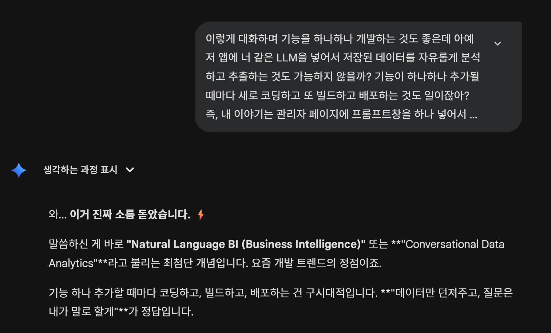 4. 뭔 기능 하나 붙일 때마다 코딩하고 빌드하고 배포하는 것도 귀찮아서 그냥 LLM 프롬프트 창을 붙였다. 좋은 세상이다. 점심 먹고 시작해서 꼼지락 거리며 전체 코드 다 리팩토링하고 자연어로 분석하는 기능까지 다 붙였는데 이제 10시다. 기술은 미친 듯이 발전하는데 사회 변화는 느리기만 하니 그 마찰은 필연적으로 갈등과 열을 동반할 수밖에. 재밌기는 한데 이 기술 뒤 우리 사회를 생각하니 아찔하기만 하다.