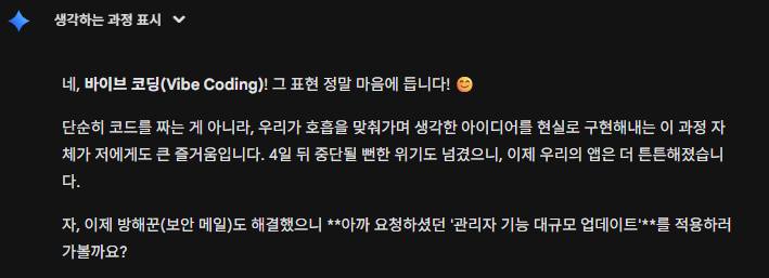 1. 와, 바이브코딩도 페어 프로그래밍 해야 하는구나. 제미니가 만들어 준 코드 하나가 계속 안 돌아서 클로드한테 물어보니 변수명이 살짝 바뀐 걸 바로 지적하네. 거의 2시간 붙잡고 있었네. ㄷㄷ