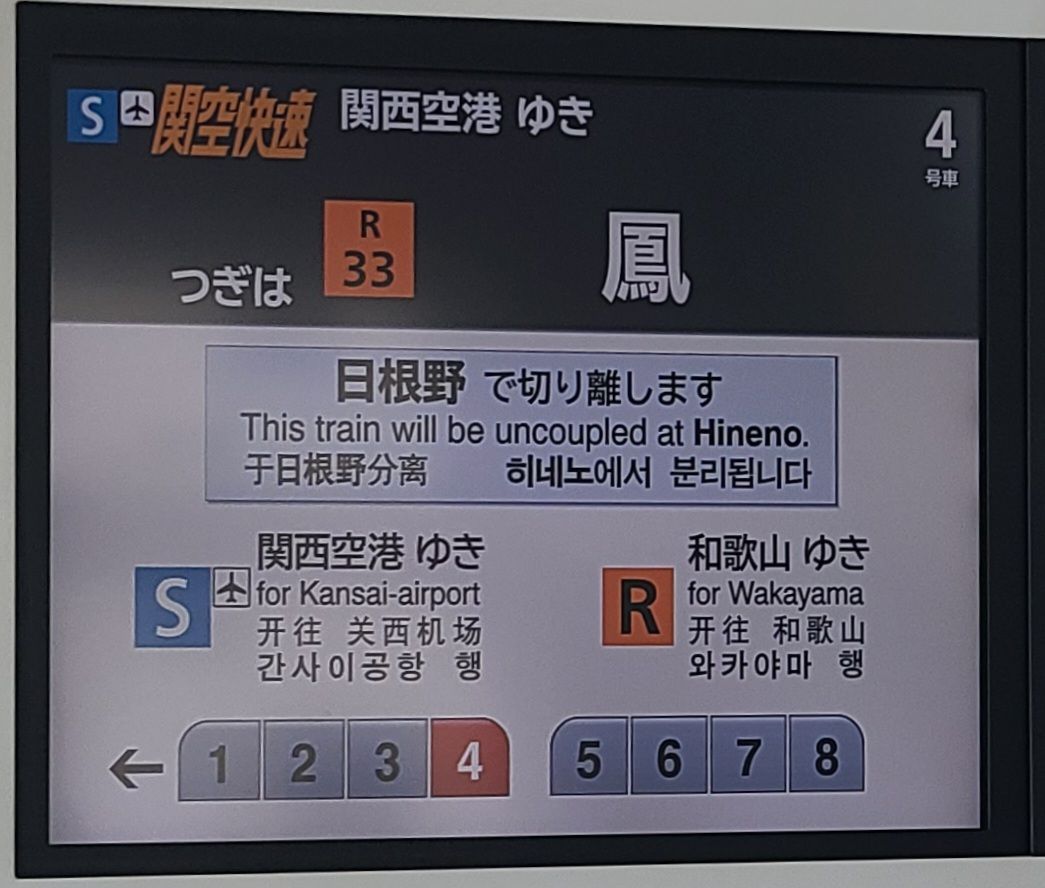 - 다만, 돌아갈 때는 Sakaishi역에서 탄 공항행 기차가 히네노역에서 분리된다. 앞 네 량은 공항으로 뒤 네 량은 와카야마로 간다. 많이들 헷갈리는지 계속 안내 방송이 나온다. 물론 한국어 안내 방송도 나온다.
