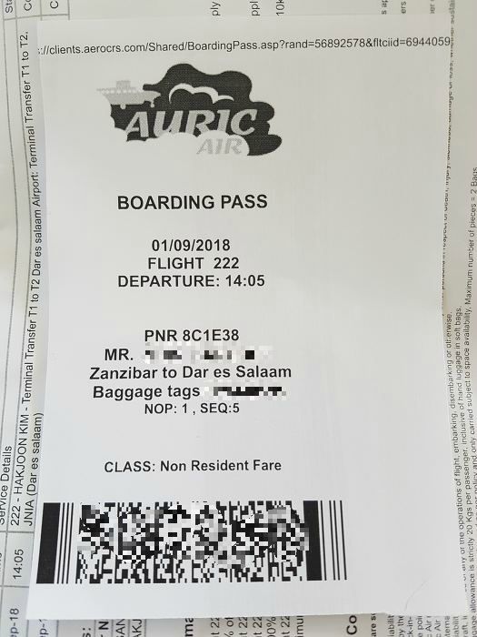 보딩패스를 이렇게 인쇄해 준다. 잔지바르에서 다르에스살람까지 비행요금은 세금 포함해서 $75달러이고 비행시간은 25분 가량 걸린다.