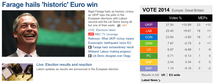 지방선거에서 만만치 않은 지지율로 급부상하더니 유럽의회 선거에서는 단박에 영국 제1당으로 올라섬.