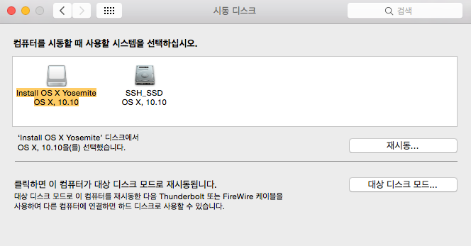 <위 과정을 거쳐 만들어진 OS X Yosemite 시동 디스크가 보인다.>