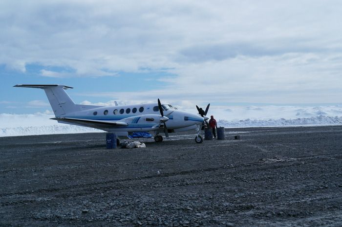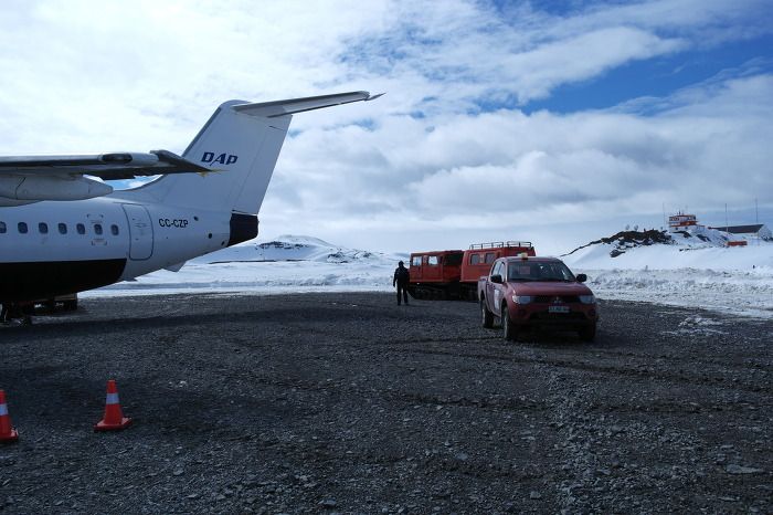 그리고, 한 두 시간 비행하면 이렇게 칠레 남극 기지에 도착한다. 아래 보이는 바와 같이 그냥 비포장 활주로에 비포장 공항이다. 무슨 터미널도 없다.